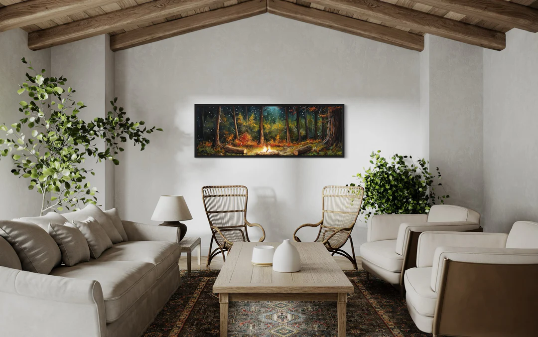 Cabin rooms often feature high ceilings and rustic proportions that accommodate larger artwork beautifully. Medium to large pieces (24×36 inches or larger) create appropriate scale, while gallery walls of smaller pieces work well for creating comprehensive displays that fill substantial wall spaces.