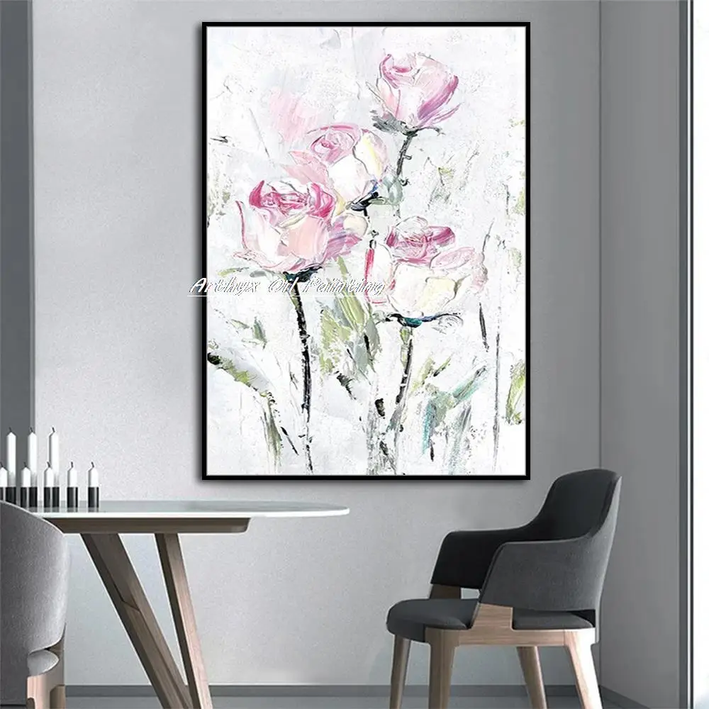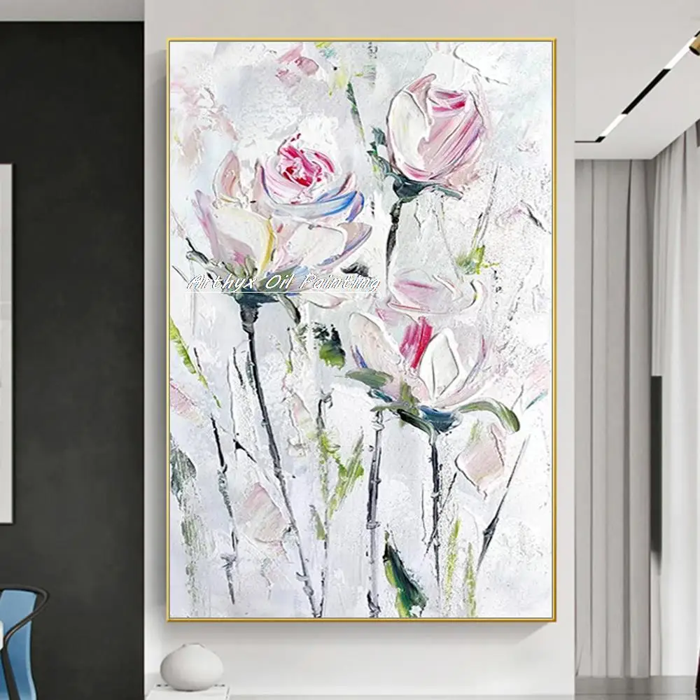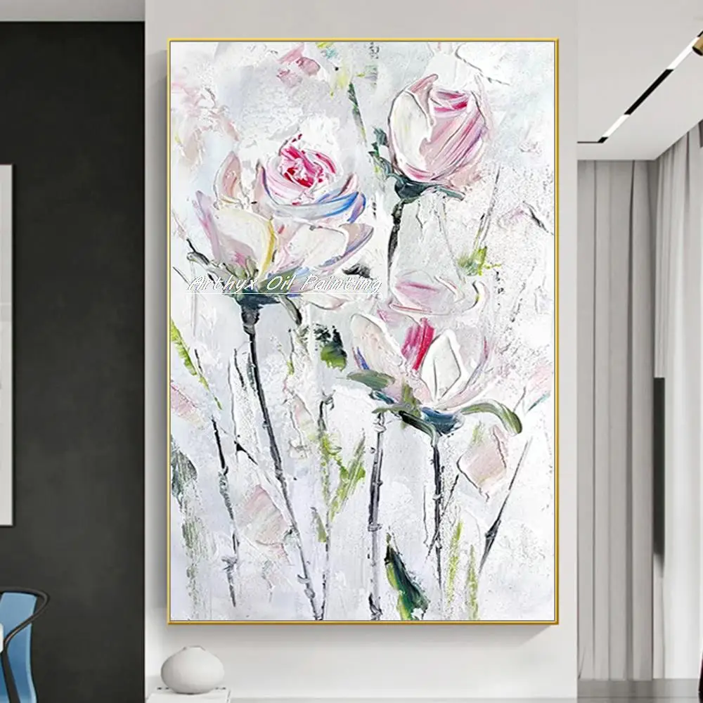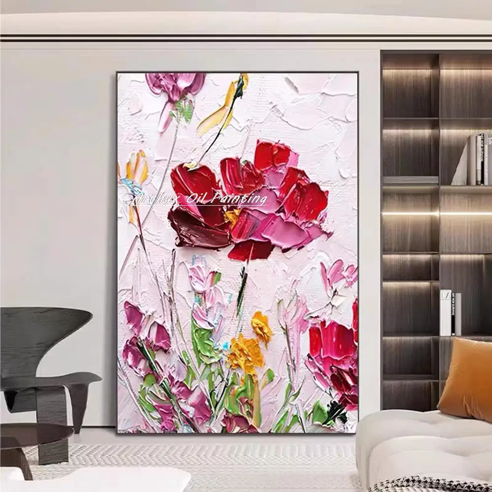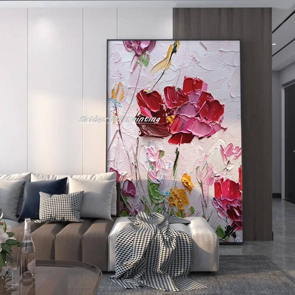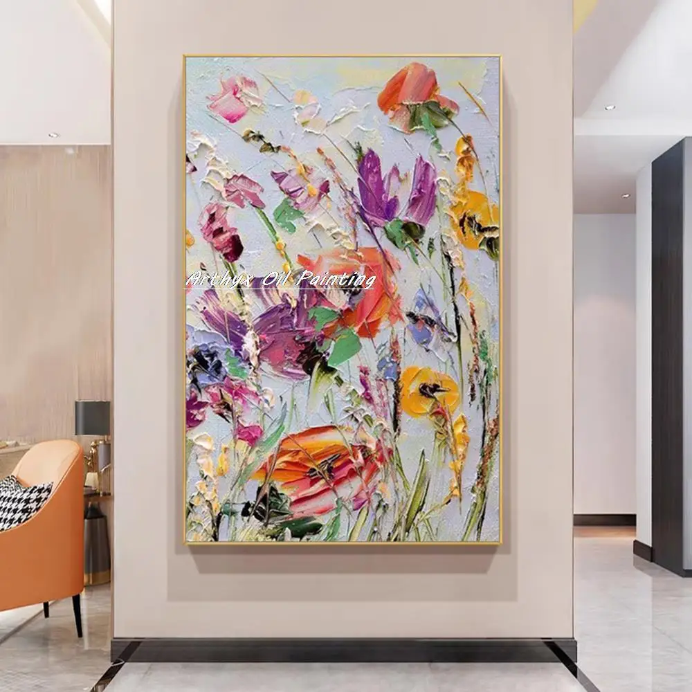 Transform your home or workspace with the exquisite artistry of the Arthyx Handmade Colorful Palette Knife Flower Oil Painting. This breathtaking vertical rectangle artwork showcases intricate details and dynamic colors, creating a stunning centerpiece for modern home decor. Perfect for various settings such as living rooms, bedrooms, dining halls, kitchens, offices, cafés, hotels, or even wine bars, this canvas painting brings sophistication and charm wherever it’s displayed.