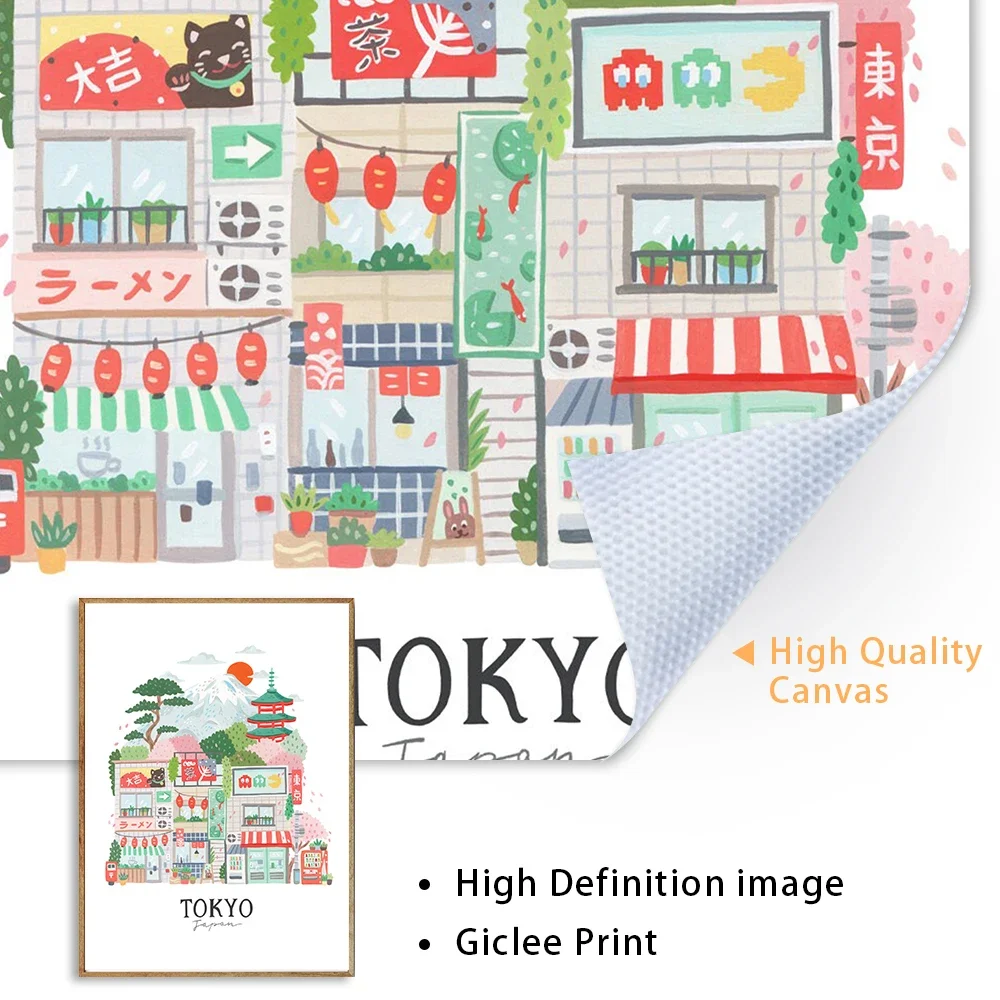 This charming canvas print showcases iconic global cities like Tokyo and Paris in a vibrant illustration style. It brings a sophisticated, wanderlust-inspired look to your walls.