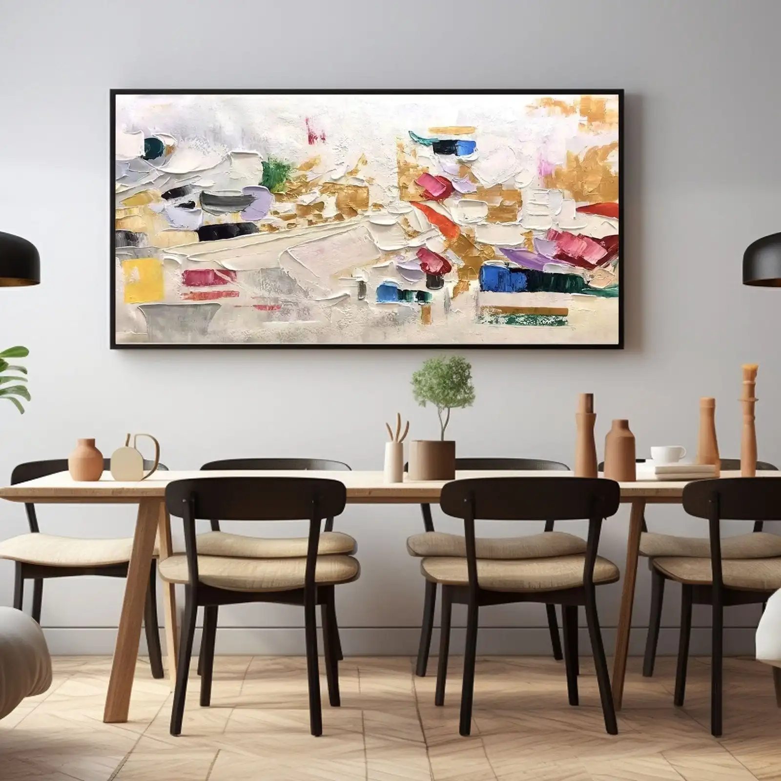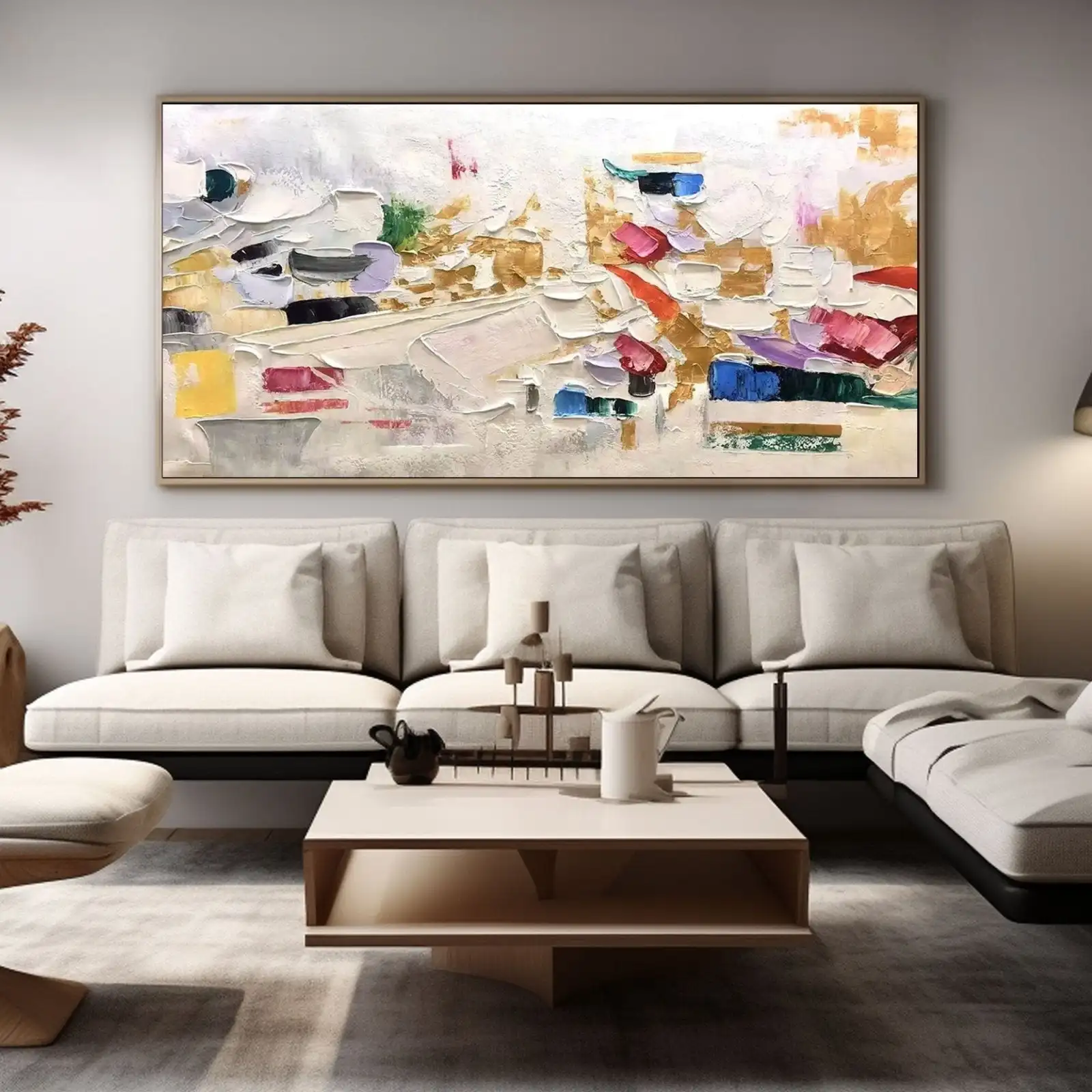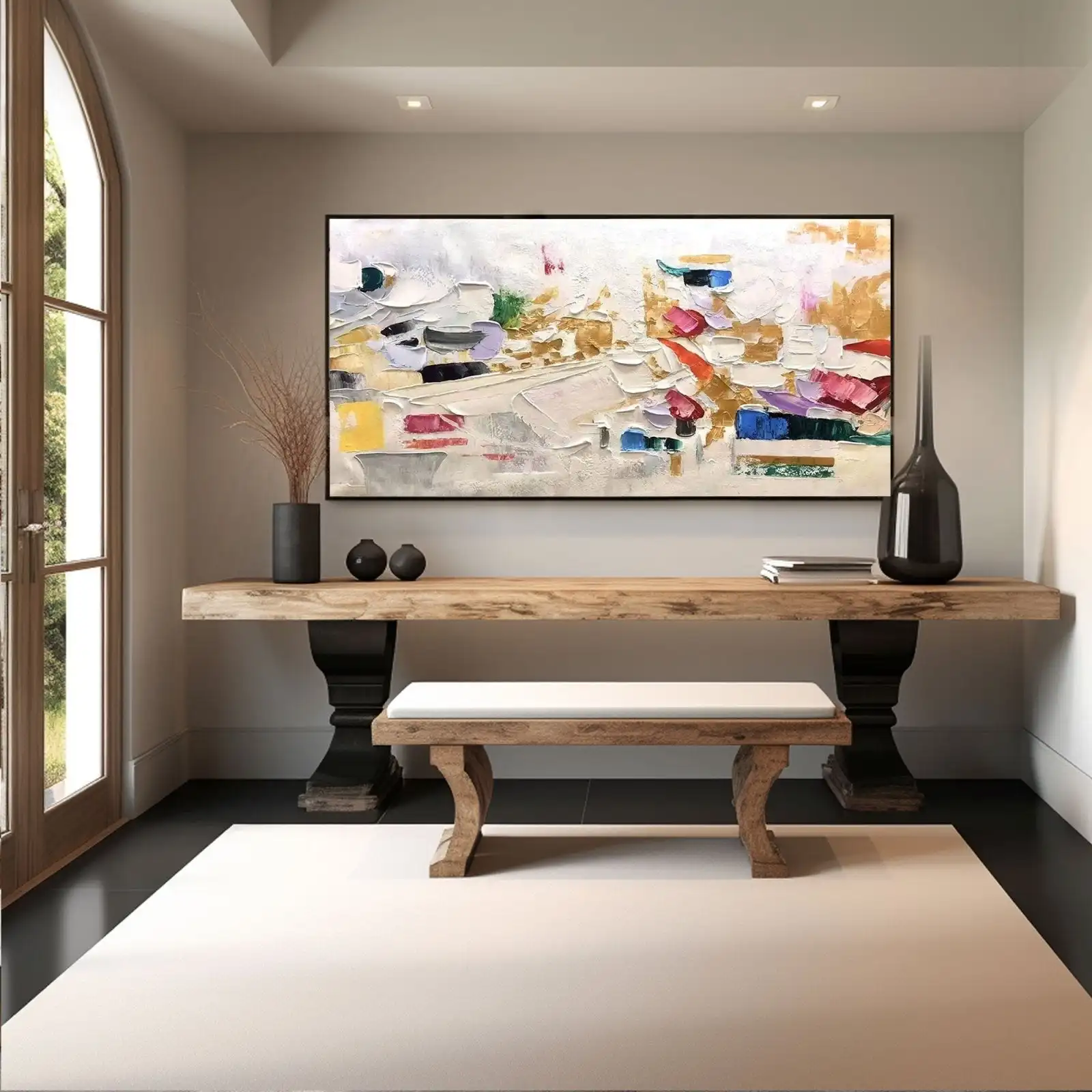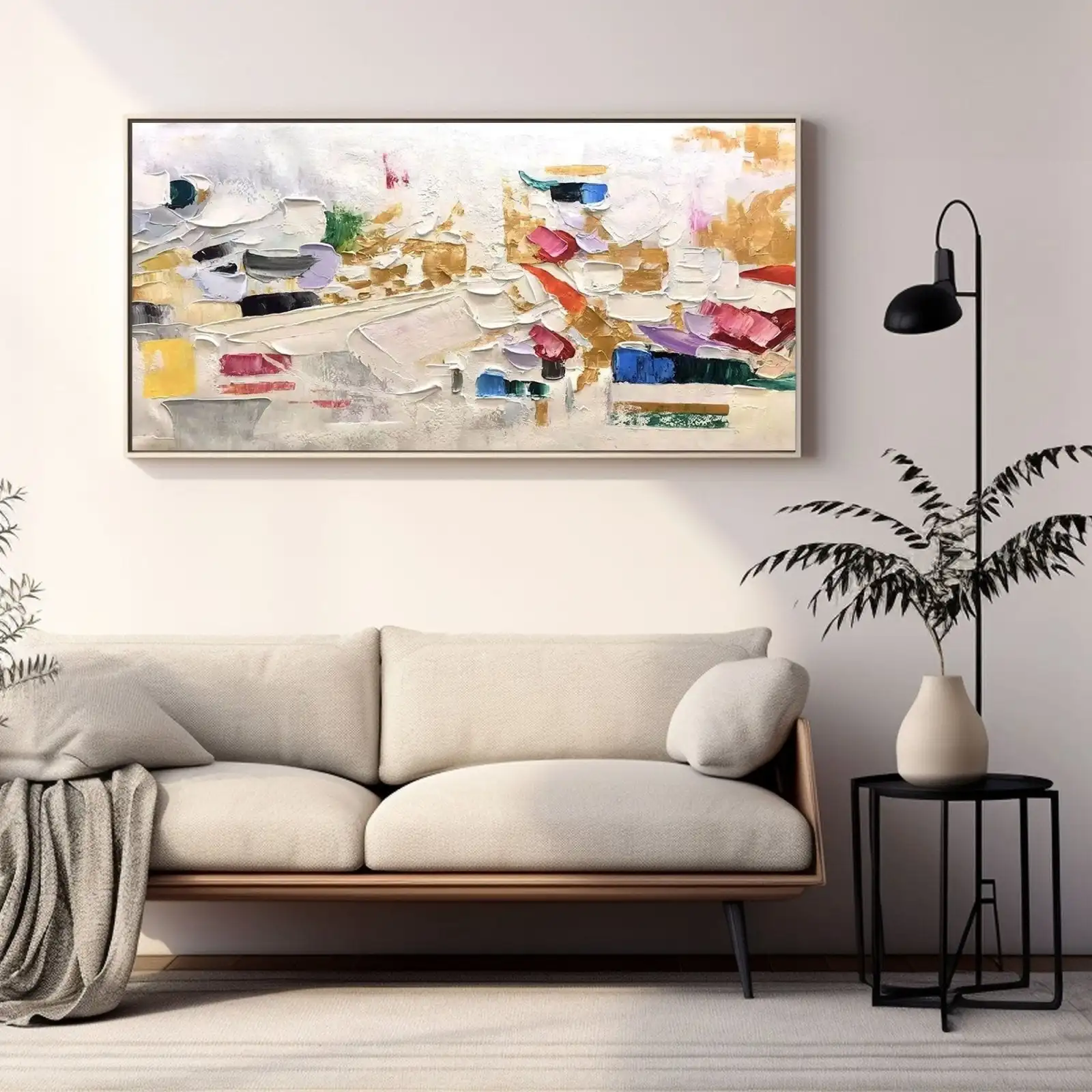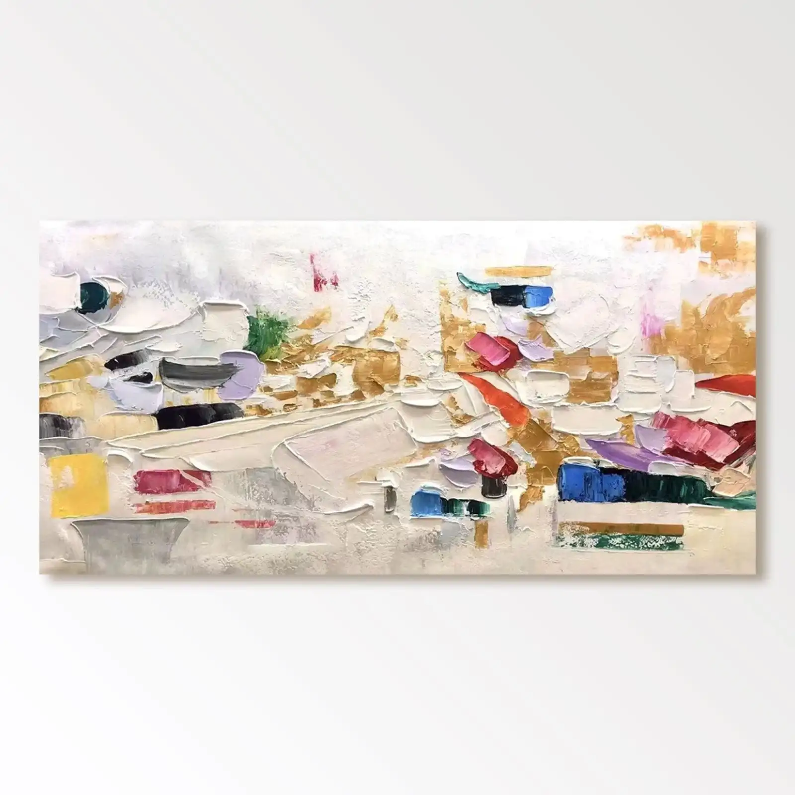 This is a beautiful, Large Handmade Abstract Oil Painting featuring vibrant color and rich texture. It’s an original, frameless piece that immediately elevates any room.
