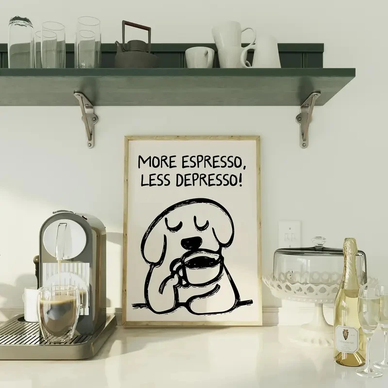 This fun print fits seamlessly into many areas of your home. Because of its compact Vertical Rectangle shape, it’s ideal for kitchens, bedrooms, or even a home office. Moreover, the amusing theme makes it a fantastic conversation starter in your living or dining room. Ultimately, this Retro Espresso Depresso Wall Art is a simple yet effective way to show off your love for coffee and sense of humor.